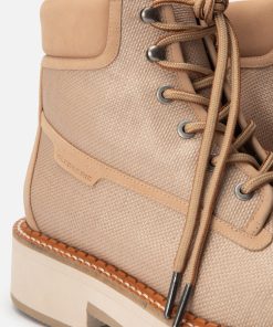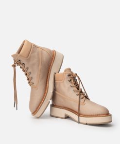Upper: Nude papyrus fabric, nude nubuck calfskin / Lining: Gold goatskin / Sole: Amber welt, nude EVA flatform, ceramic sole