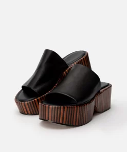 Upper: Black lambskin / Lining: Black crust lambskin / Sole: Dark brown and black stacked leather platform, arizona sole, black edge