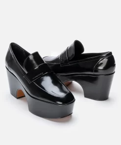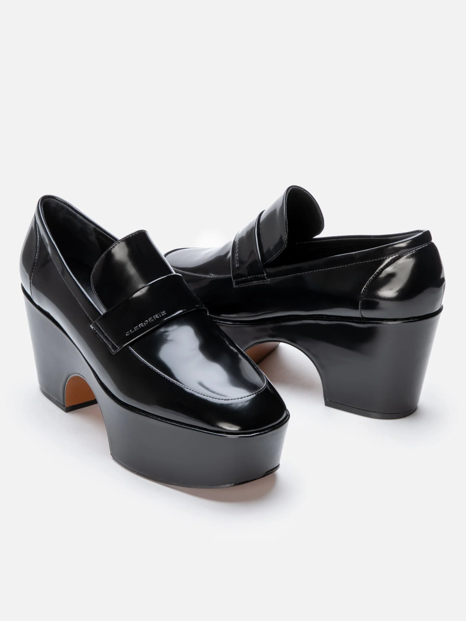 Upper: black glossed calfskin / Lining: black goatskin lining / Sole: black glossed calfskin covered platform, amber leather sole, black edge